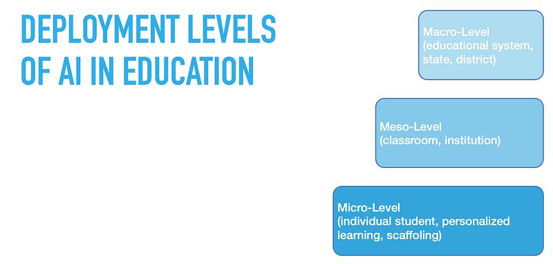 On the micro-level, AI Ed caters to individual student needs by offering personalized learning experiences, adapting content, and providing real-time feedback and scaffolding, thereby fostering a more student-centric approach to education. At the meso-level, AI can aid teachers in individual classrooms or entire educational institutions in streamlining student support, administrative tasks, optimizing resource allocation, and enhancing operational efficiency, contributing to an overall improvement in the institutional ecosystem. On the macro-level, the employment of AI towards educational systems, for instance in large-scale assessments such as PISA and PIAAC,  facilitates data-driven policymaking, enabling education authorities to make informed decisions for large-scale improvements in curriculum design, teacher training, and infrastructure development.